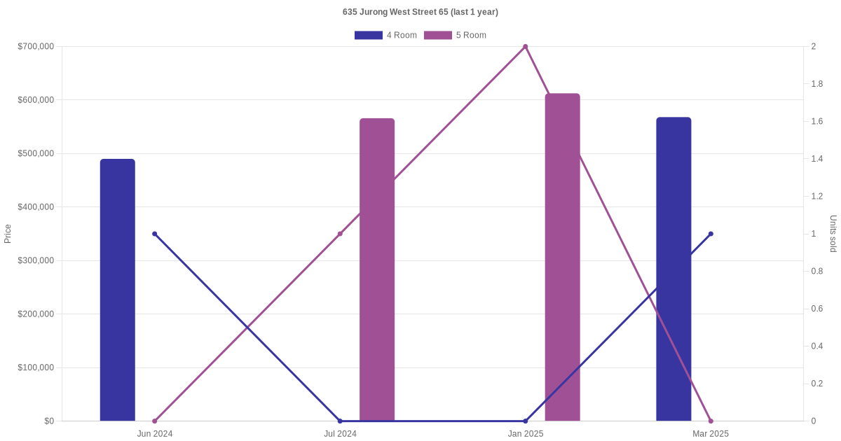 Below is a quick summary of the resale transactions volume and average price trends for the 4 room and 5 room units at 635 Jurong West Street 65.