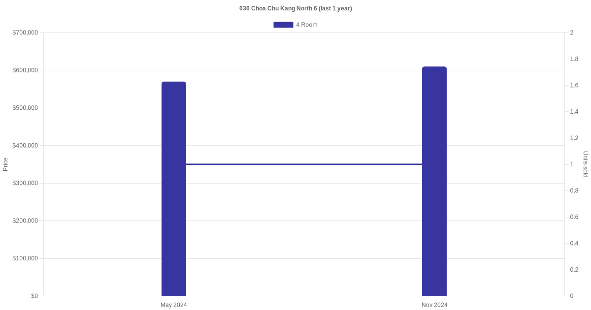 There were a total of 4 resale transactions in the last 3 years for units in block 636 Choa Chu Kang North 6, with the latest one recorded in Nov 2024.