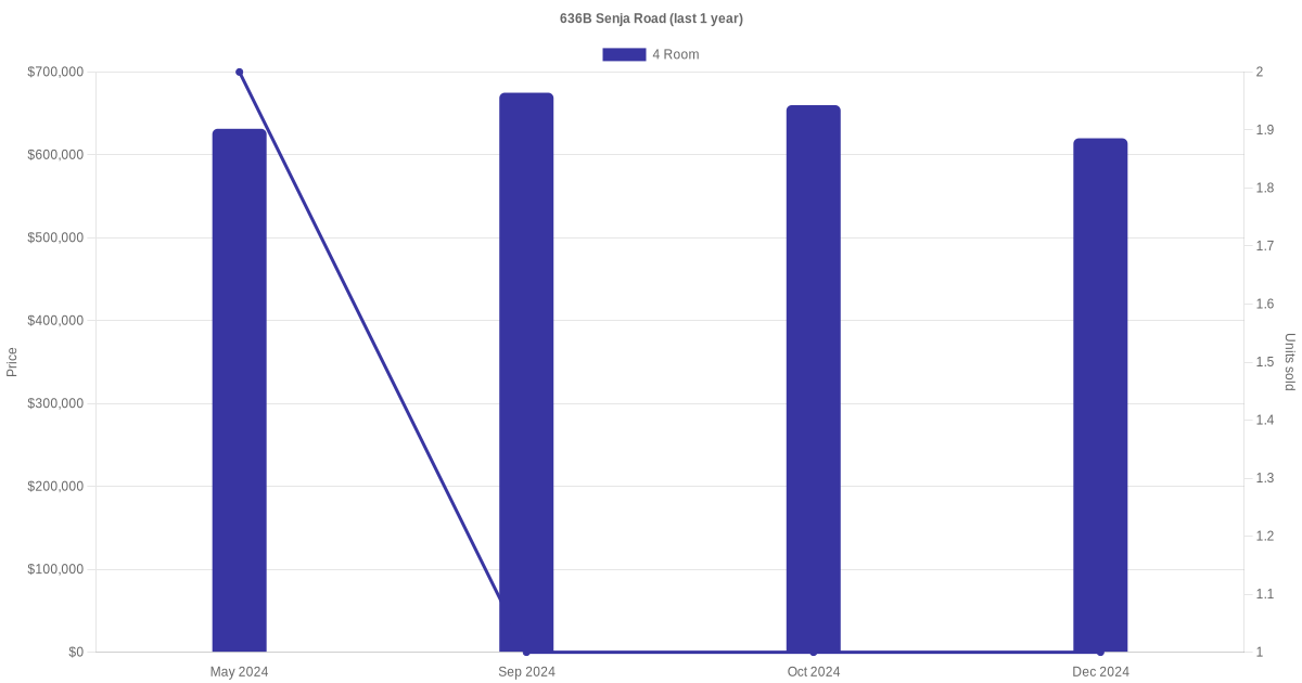 Below is a quick summary of the resale transactions volume and average price trends for the 4 room units at 636B Senja Road.