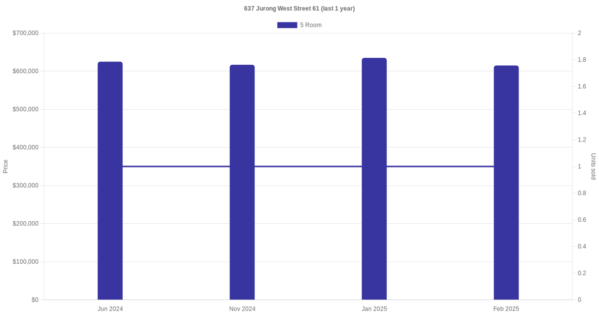 Below is a quick summary of the resale transactions volume and average price trends for the 4 room and 5 room units at 637 Jurong West Street 61.