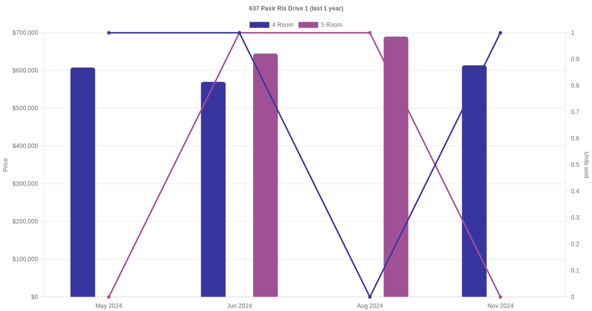 Below is a quick summary of the resale transactions volume and average price trends for the 4 room and 5 room units at 637 Pasir Ris Drive 1.