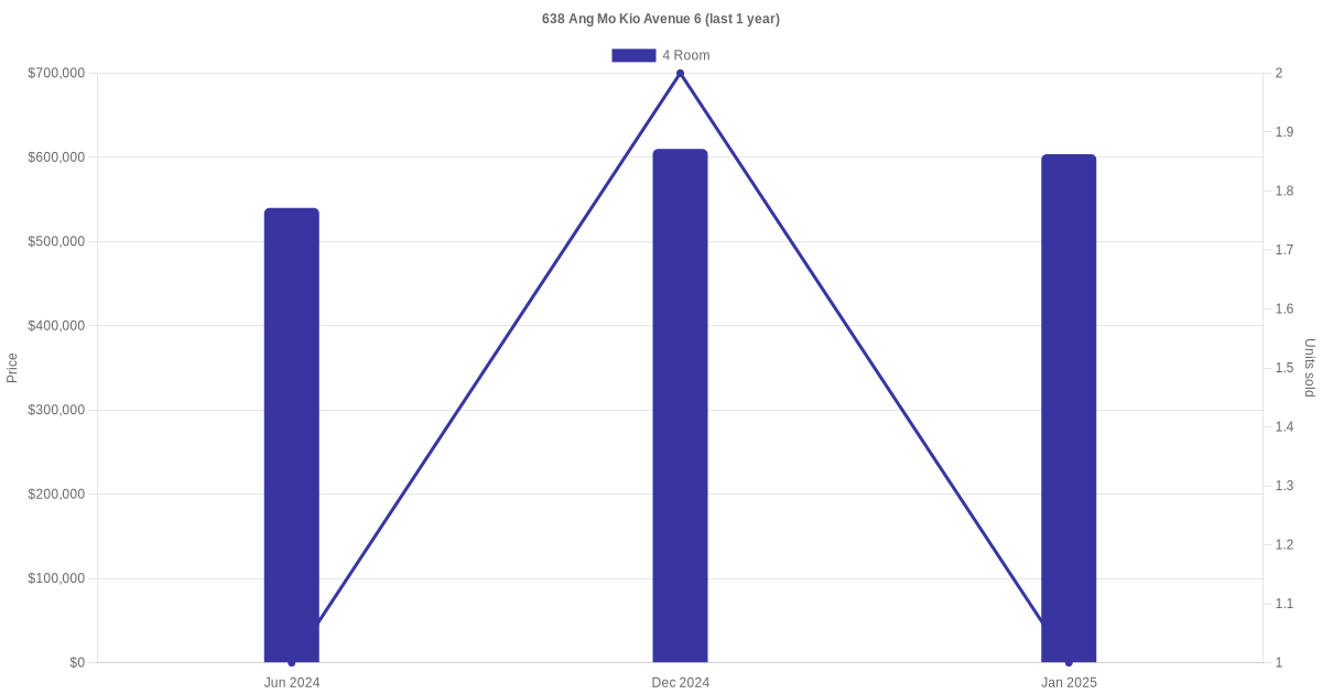 Below is a quick summary of the resale transactions volume and average price trends for the 4 room units at 638 Ang Mo Kio Avenue 6.