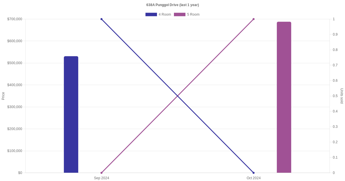 Below is a quick summary of the resale transactions volume and average price trends for the 4 room and 5 room units at 638A Punggol Drive.