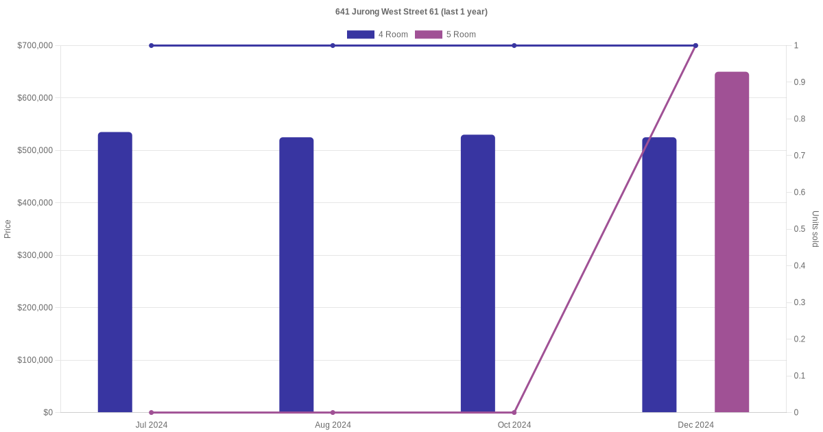 Below is a quick summary of the resale transactions volume and average price trends for the 4 room and 5 room units at 641 Jurong West Street 61.