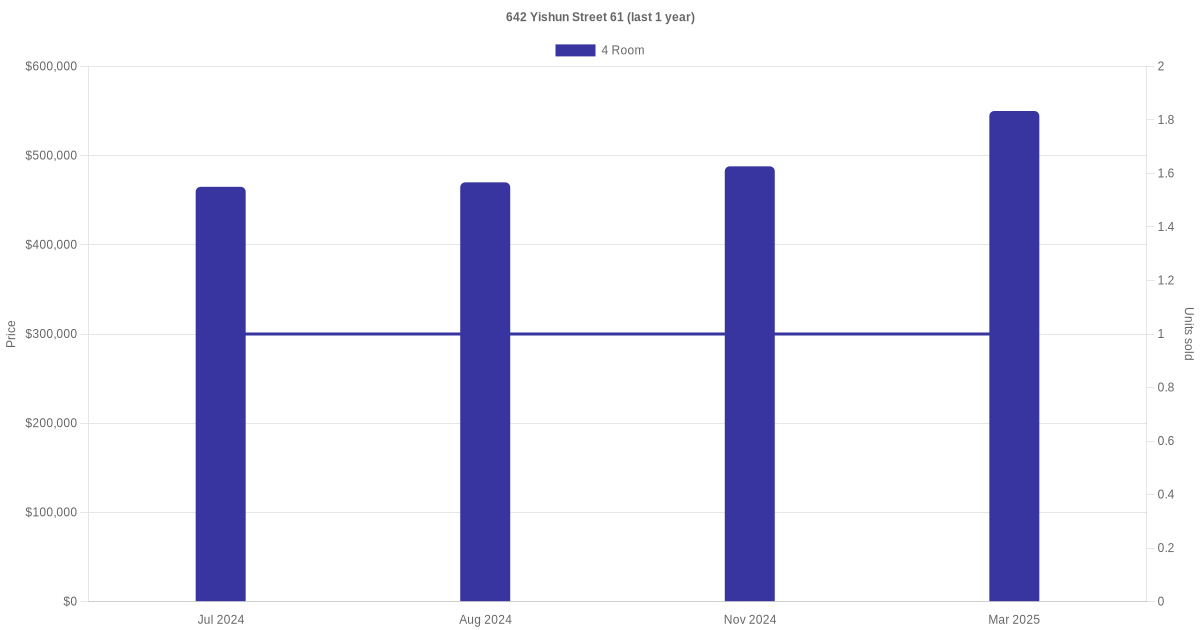 Below is a quick summary of the resale transactions volume and average price trends for the 4 room units at 642 Yishun Street 61.