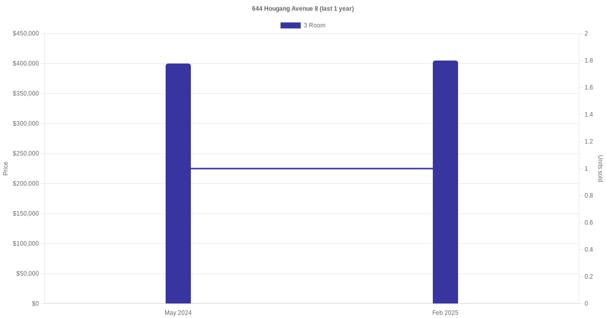 Below is a quick summary of the resale transactions volume and average price trends for the 3 room units at 644 Hougang Avenue 8.