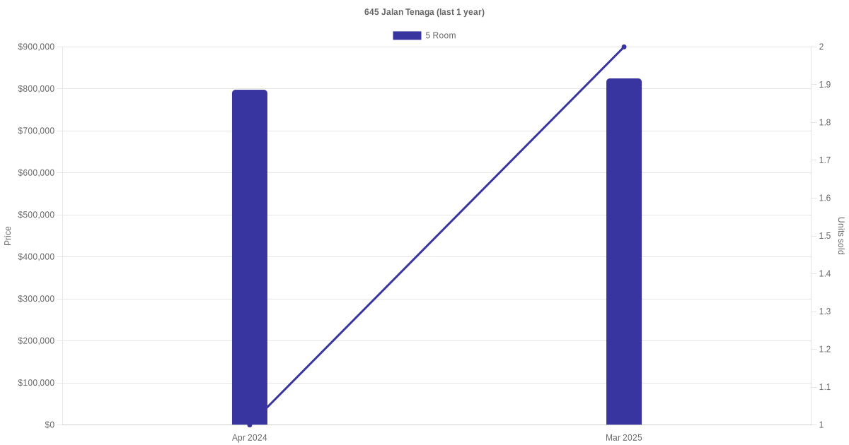Below is a quick summary of the resale transactions volume and average price trends for the 5 room units at 645 Jalan Tenaga.