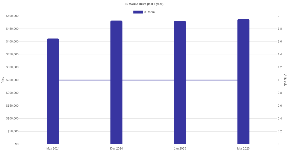 Below is a quick summary of the resale transactions volume and average price trends for the 3 room units at 65 Marine Drive.