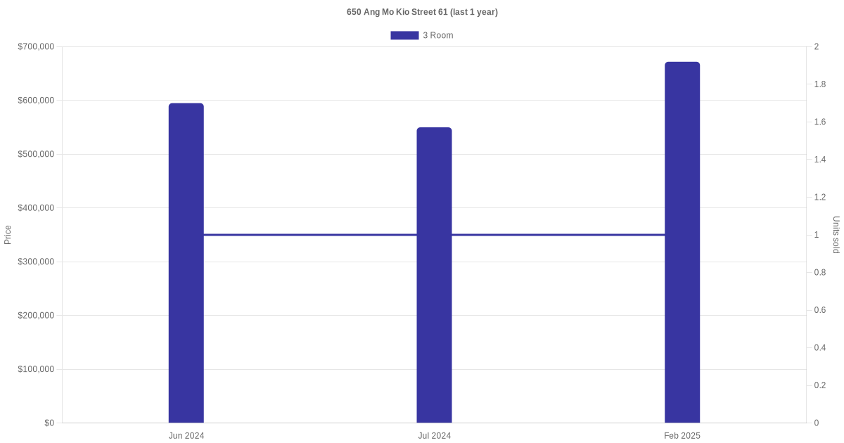 650 Ang Mo Kio Street 61 is an HDB block located in Ang Mo Kio. It has 3 room units and the highest floor is 21. The block was completed in 2014 and the lease with HDB commenced in 2015. This means that the remaining lease period is approximately 95 years. The unit floor size is 67sqm. The latest resale transaction was in Dec 2025 and the highest transacted price was recorded in Dec 2025 for a 3 room unit at $721,000.