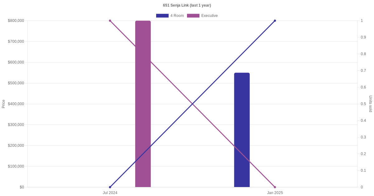 There were a total of 4 resale transactions in the last 3 years for units in block 651 Senja Link, with the latest one recorded in Jan 2025.