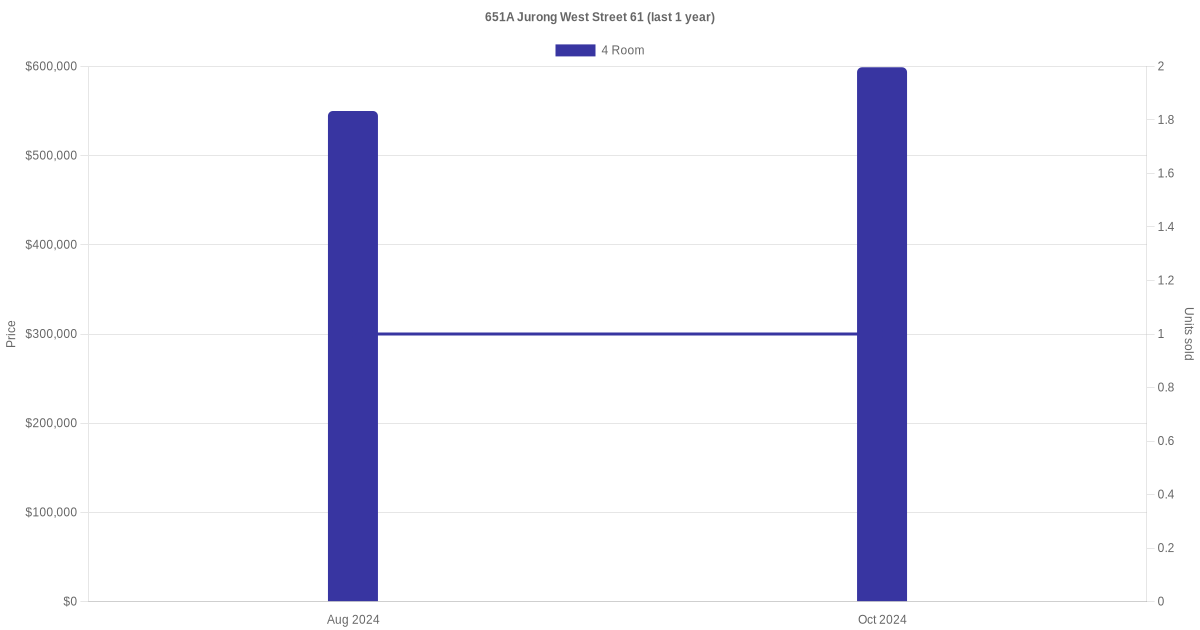 Below is a quick summary of the resale transactions volume and average price trends for the 4 room units at 651A Jurong West Street 61.
