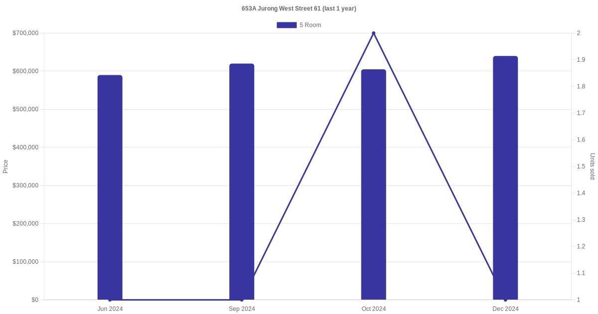 Below is a quick summary of the resale transactions volume and average price trends for the 5 room units at 653A Jurong West Street 61.