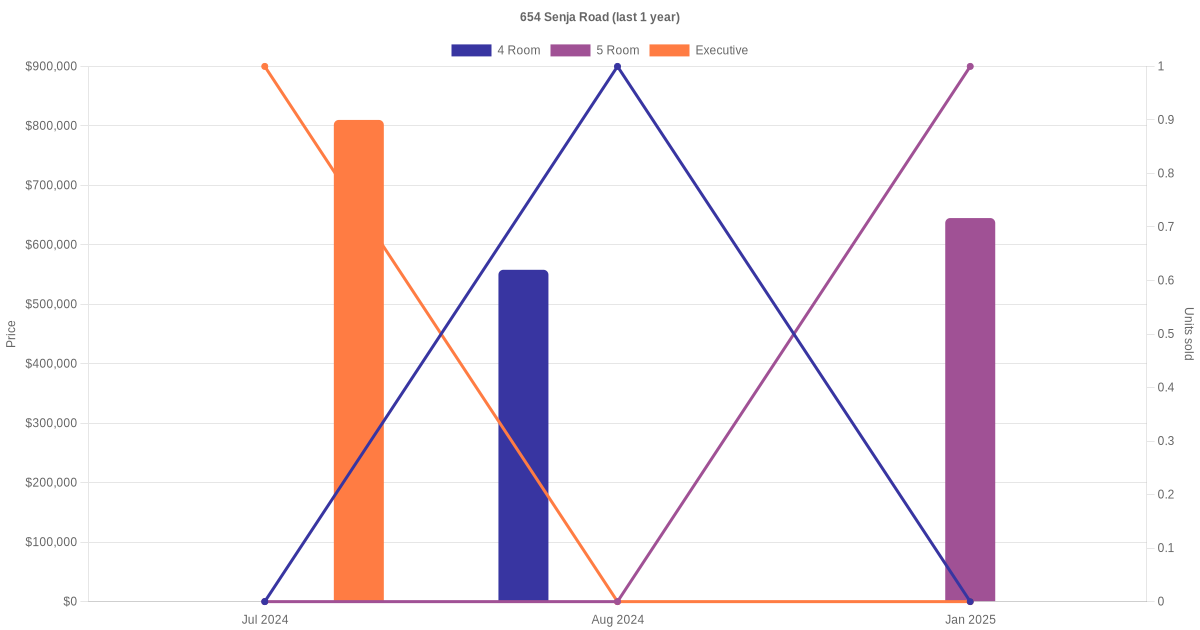 Below is a quick summary of the resale transactions volume and average price trends for the 4 room, 5 room and executive units at 654 Senja Road.