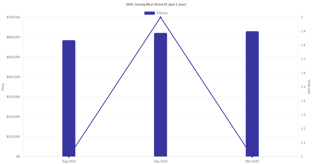 There were a total of 6 resale transactions in the last 3 years for units in block 654C Jurong West Street 61, with the latest one recorded in Mar 2025.