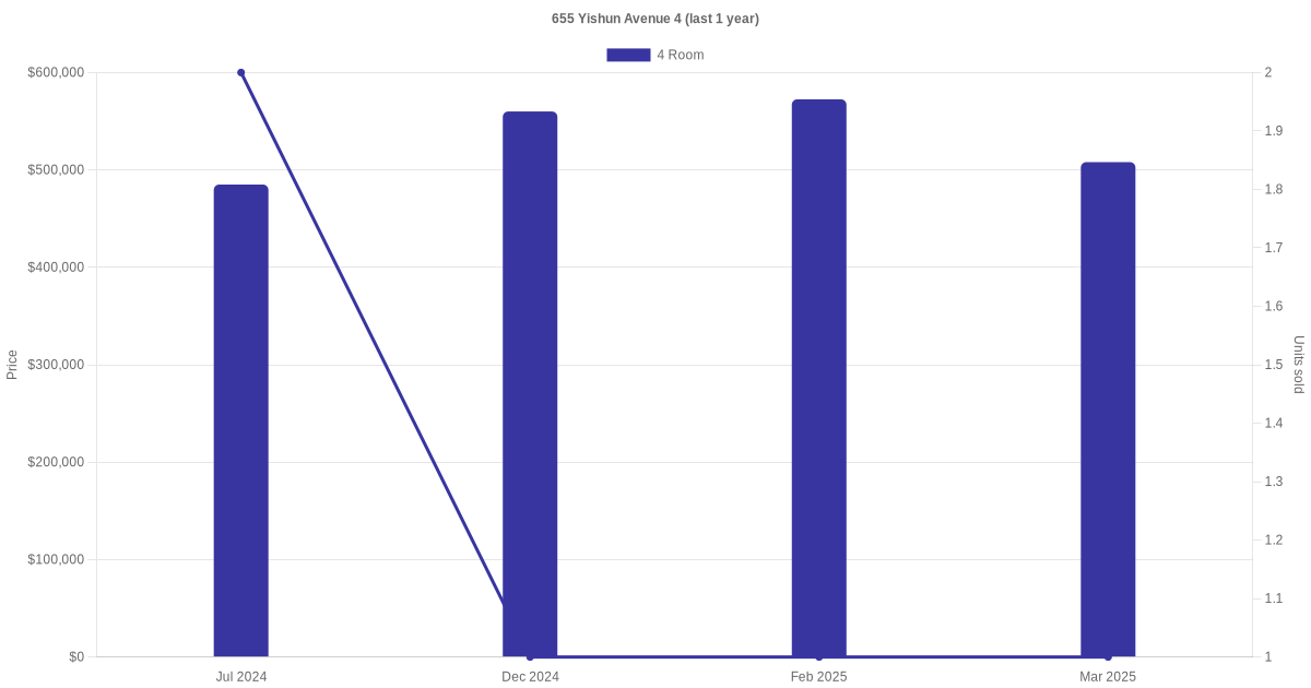 Below is a quick summary of the resale transactions volume and average price trends for the 4 room units at 655 Yishun Avenue 4.