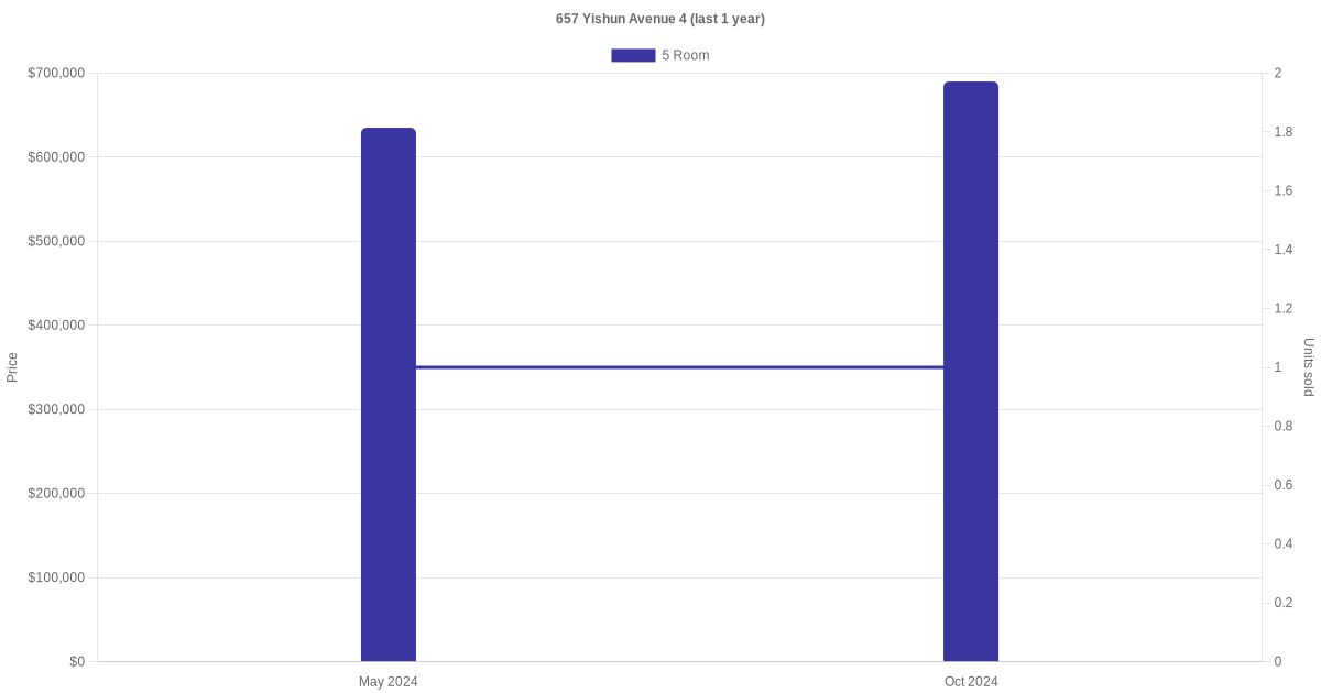 Below is a quick summary of the resale transactions volume and average price trends for the 4 room and 5 room units at 657 Yishun Avenue 4.