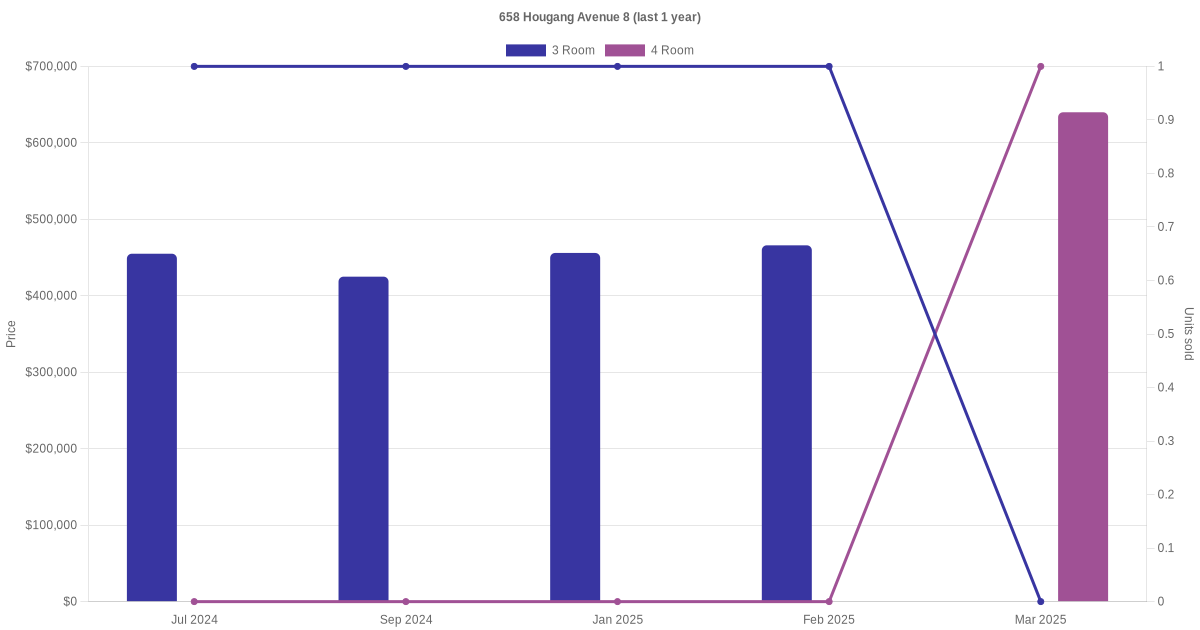 Below is a quick summary of the resale transactions volume and average price trends for the 3 room and 4 room units at 658 Hougang Avenue 8.