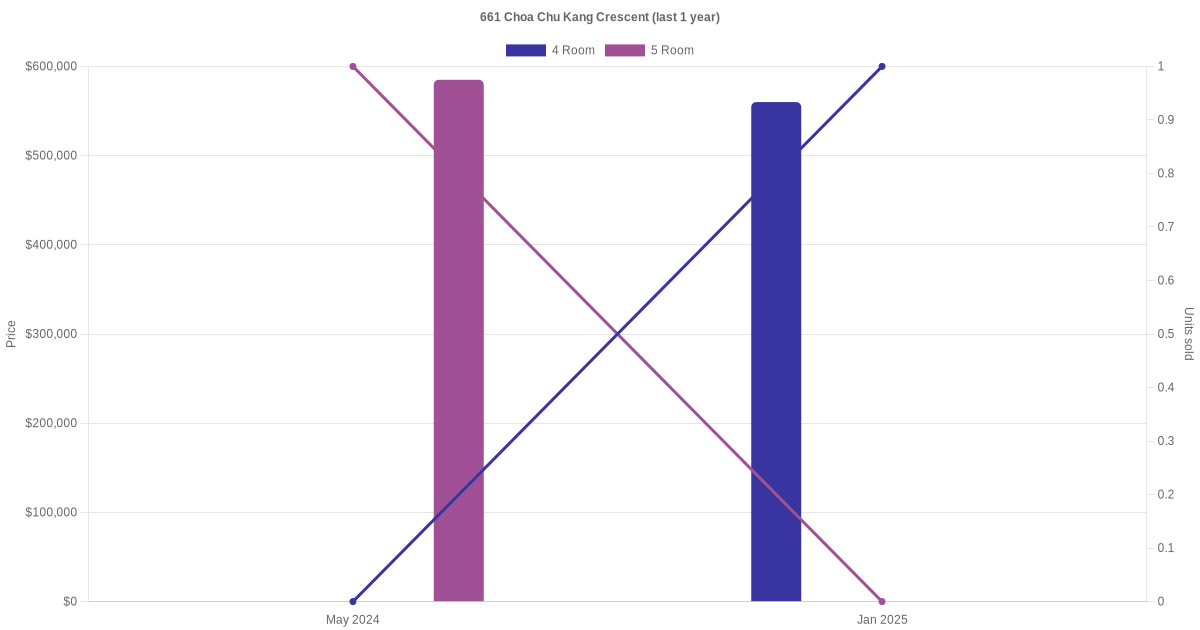 Below is a quick summary of the resale transactions volume and average price trends for the 4 room and 5 room units at 661 Choa Chu Kang Crescent.