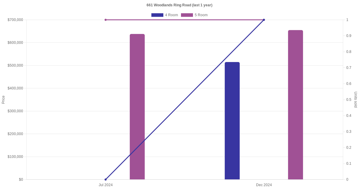 Below is a quick summary of the resale transactions volume and average price trends for the 4 room and 5 room units at 661 Woodlands Ring Road.