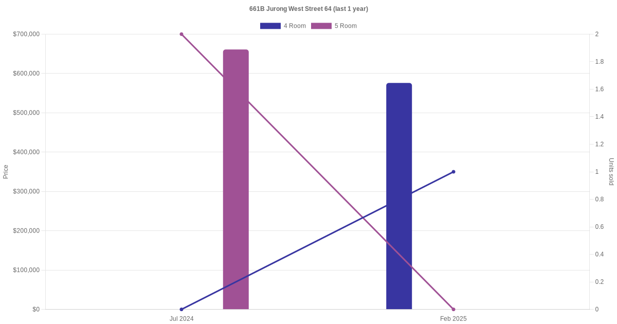Below is a quick summary of the resale transactions volume and average price trends for the 4 room and 5 room units at 661B Jurong West Street 64.
