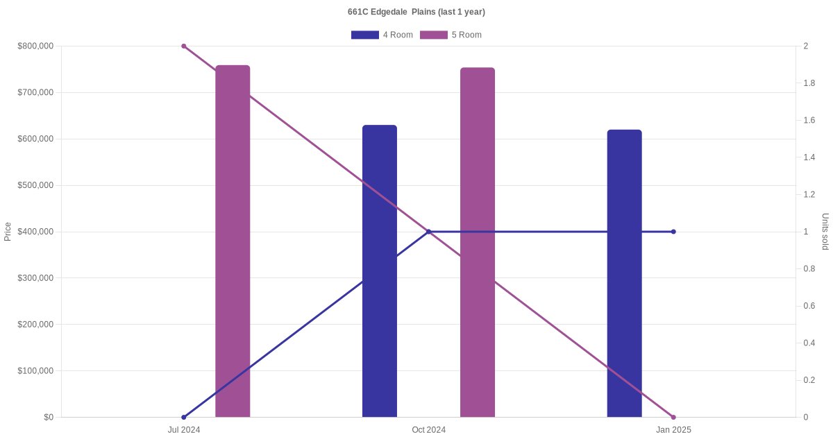 Below is a quick summary of the resale transactions volume and average price trends for the 4 room and 5 room units at 661C Edgedale Plains.
