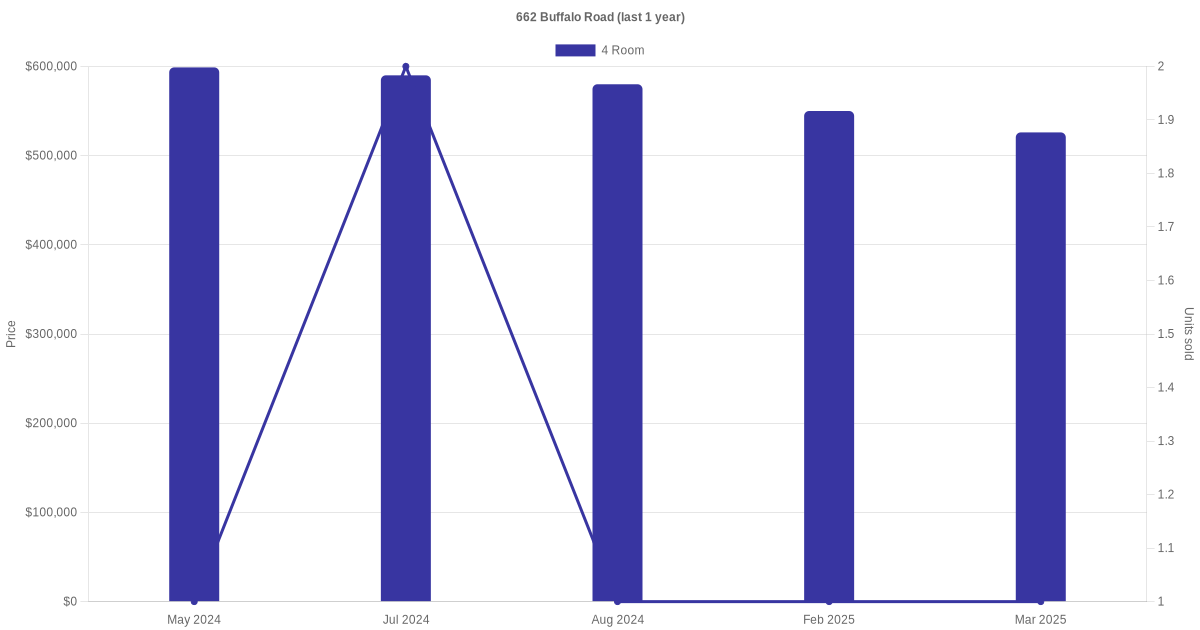 Below is a quick summary of the resale transactions volume and average price trends for the 4 room units at 662 Buffalo Road.