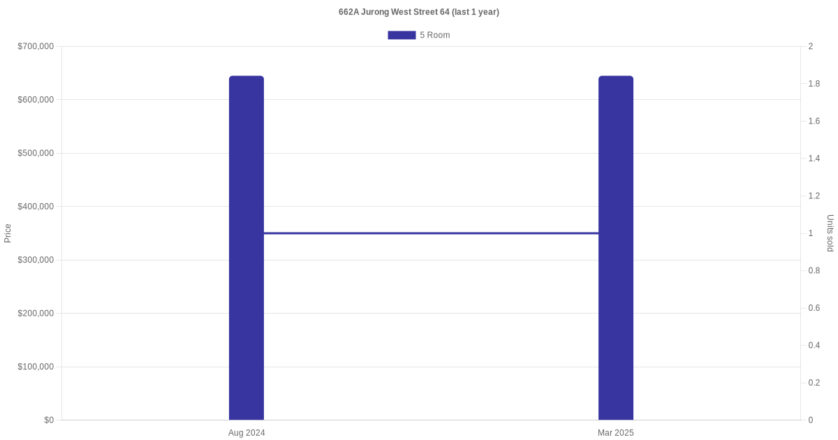 There were a total of 5 resale transactions in the last 3 years for units in block 662A Jurong West Street 64, with the latest one recorded in Mar 2025.