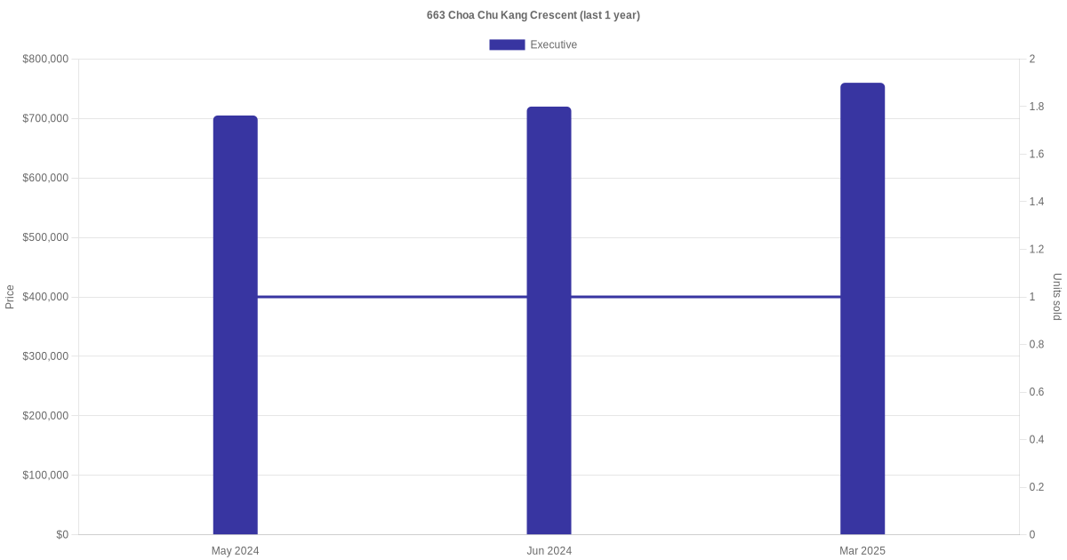 Below is a quick summary of the resale transactions volume and average price trends for the executive units at 663 Choa Chu Kang Crescent.