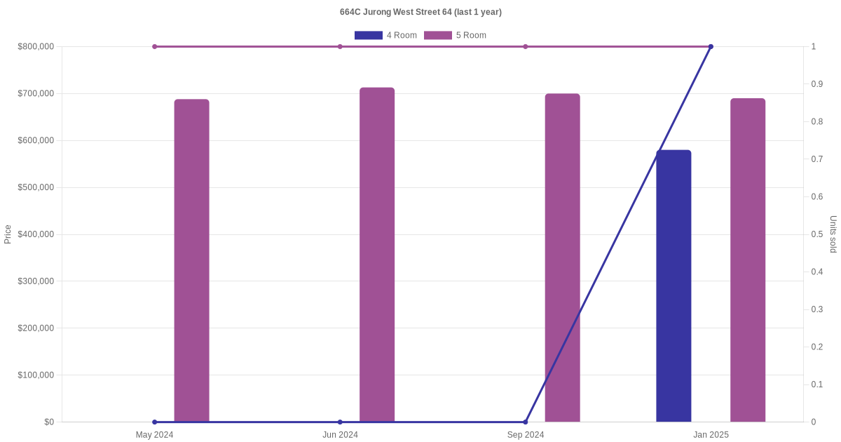 Below is a quick summary of the resale transactions volume and average price trends for the 4 room and 5 room units at 664C Jurong West Street 64.