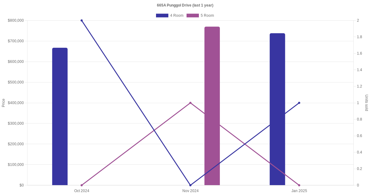 Below is a quick summary of the resale transactions volume and average price trends for the 4 room and 5 room units at 665A Punggol Drive.