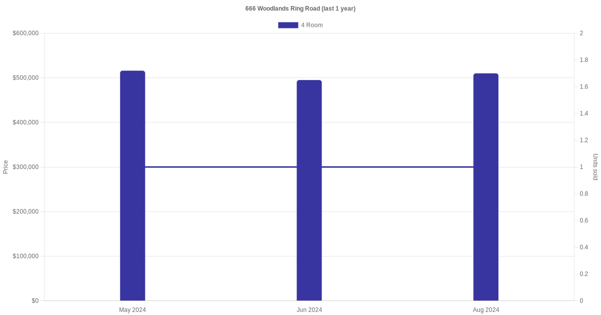 Below is a quick summary of the resale transactions volume and average price trends for the 4 room units at 666 Woodlands Ring Road.