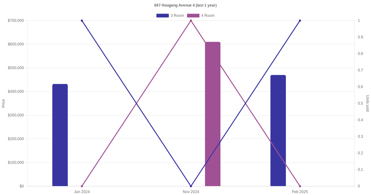Below is a quick summary of the resale transactions volume and average price trends for the 3 room and 4 room units at 667 Hougang Avenue 4.