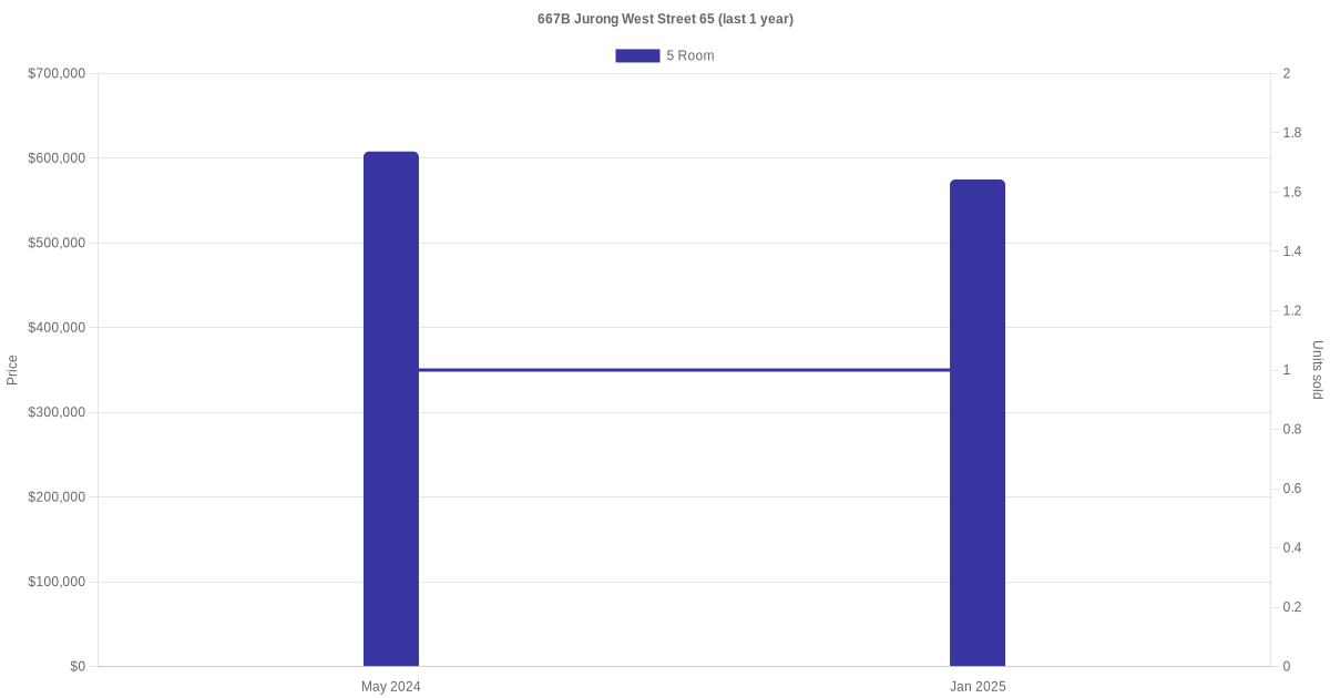 There were a total of 7 resale transactions in the last 3 years for units in block 667B Jurong West Street 65, with the latest one recorded in Jan 2025.