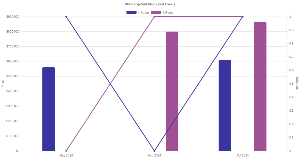 Below is a quick summary of the resale transactions volume and average price trends for the 4 room and 5 room units at 668B Edgefield Plains.