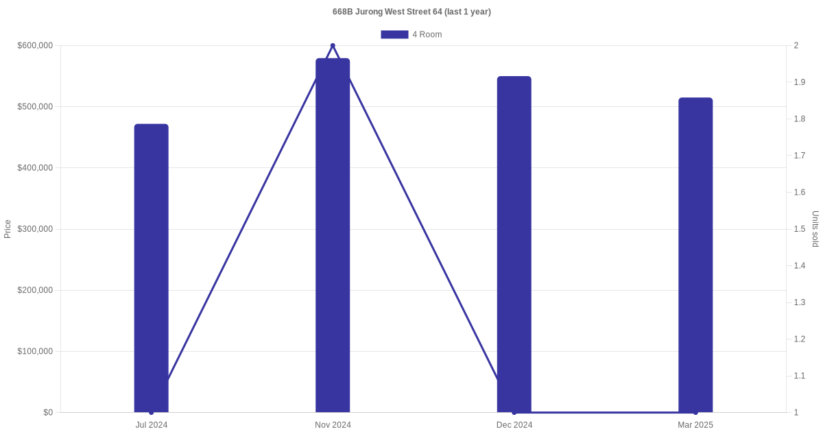 Below is a quick summary of the resale transactions volume and average price trends for the 4 room units at 668B Jurong West Street 64.
