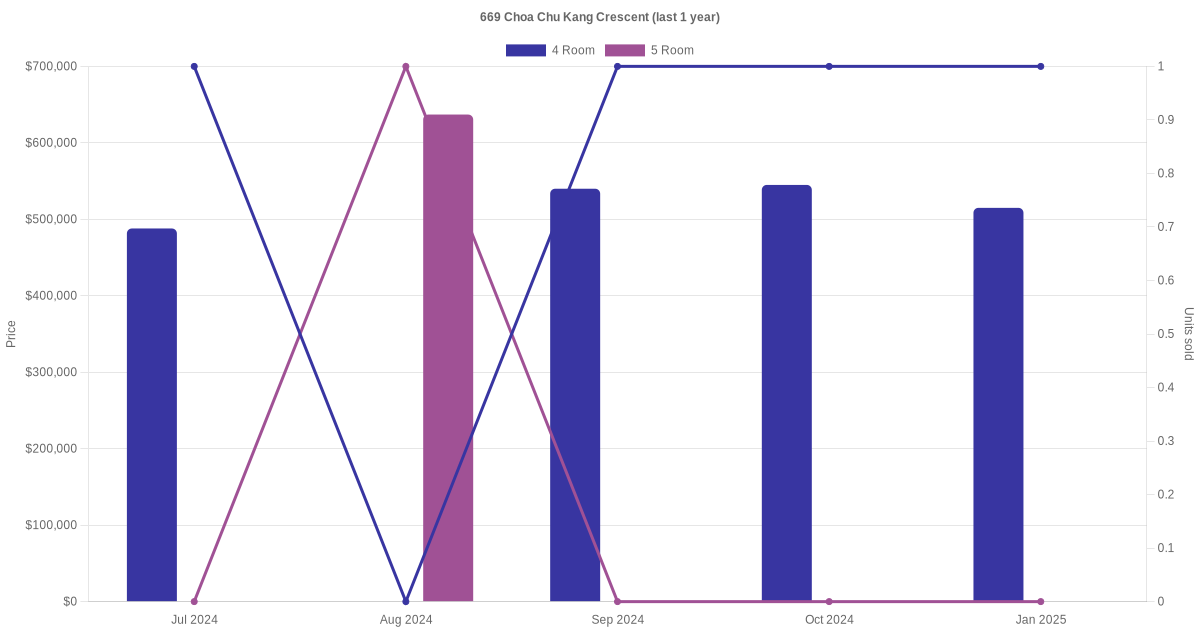Below is a quick summary of the resale transactions volume and average price trends for the 4 room and 5 room units at 669 Choa Chu Kang Crescent.