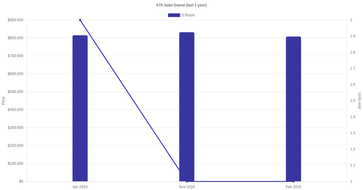 Below is a quick summary of the resale transactions volume and average price trends for the 5 room units at 670 Jalan Damai.