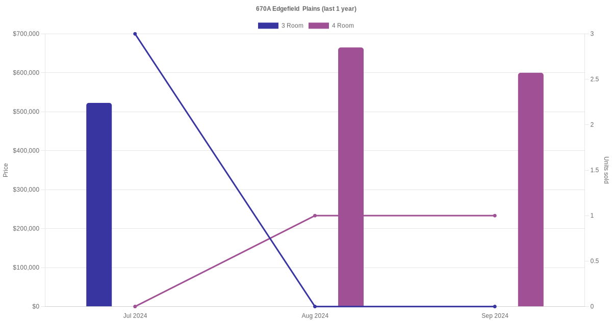 Below is a quick summary of the resale transactions volume and average price trends for the 3 room and 4 room units at 670A Edgefield Plains.