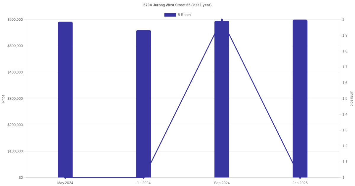Below is a quick summary of the resale transactions volume and average price trends for the 5 room units at 670A Jurong West Street 65.