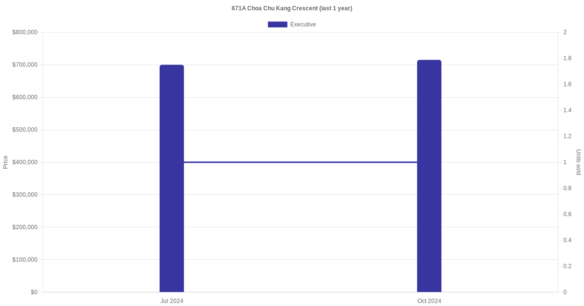 | Oct 2024 | $715,000 | $5,071 | Executive | Blk 671A Choa Chu Kang Crescent Executive / 141 sqm | 04 to 06 | 141 sqm | Premium Apartment | 2000 |