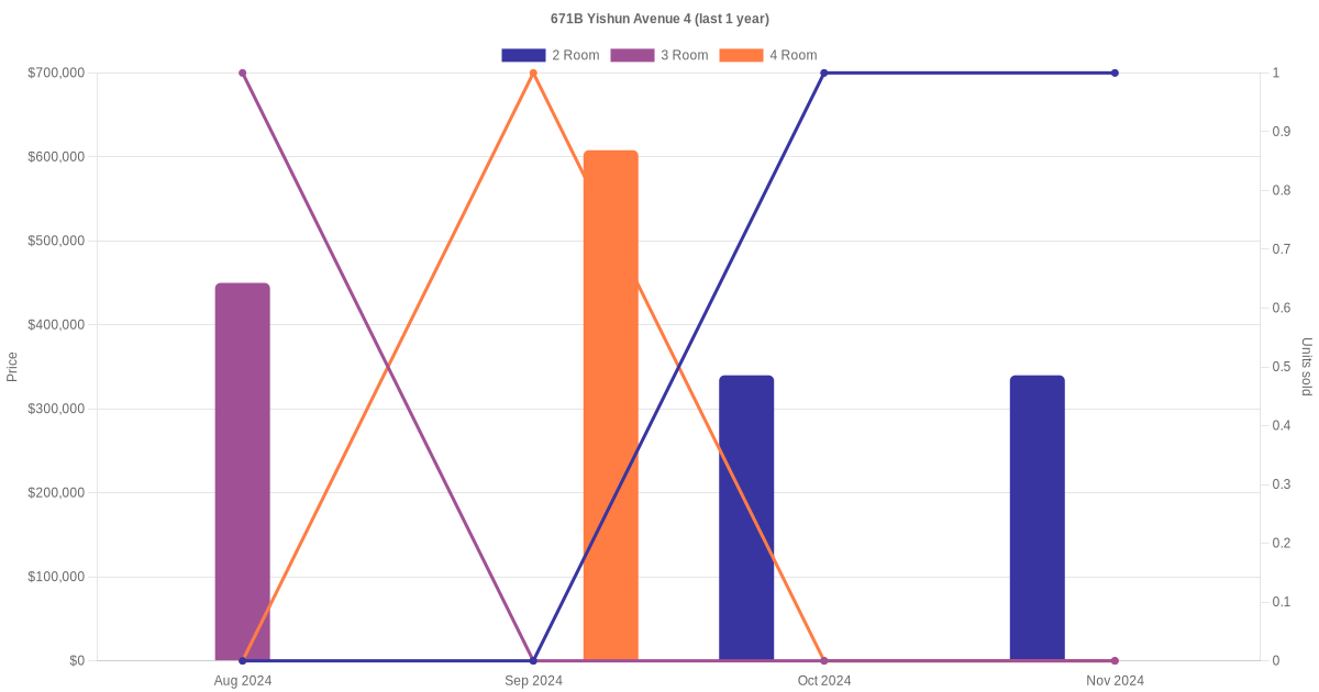 Below is a quick summary of the resale transactions volume and average price trends for the 2 room, 3 room and 4 room units at 671B Yishun Avenue 4.