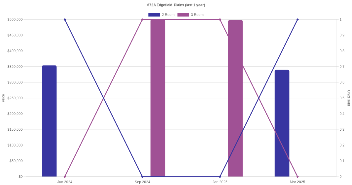 Below is a quick summary of the resale transactions volume and average price trends for the 2 room and 3 room units at 672A Edgefield Plains.