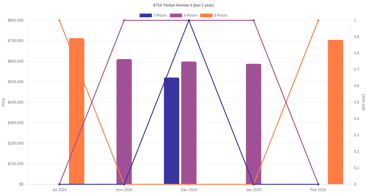 Below is a quick summary of the resale transactions volume and average price trends for the 3 room, 4 room and 5 room units at 673A Yishun Avenue 4.