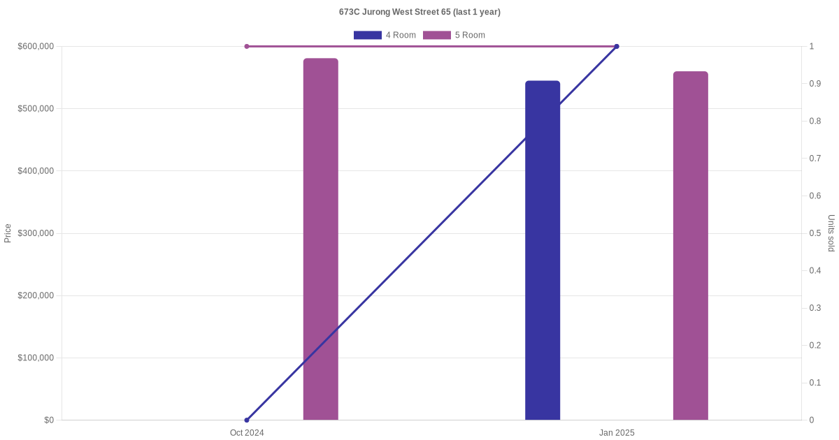Below is a quick summary of the resale transactions volume and average price trends for the 4 room and 5 room units at 673C Jurong West Street 65.
