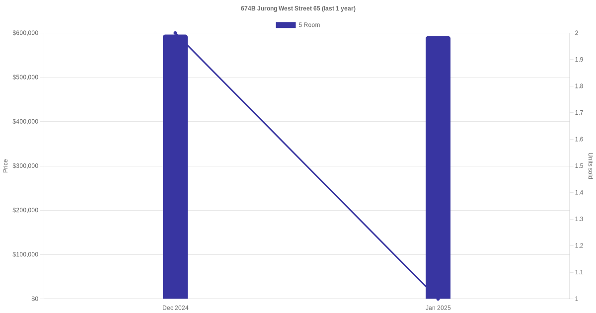 Below is a quick summary of the resale transactions volume and average price trends for the 5 room units at 674B Jurong West Street 65.