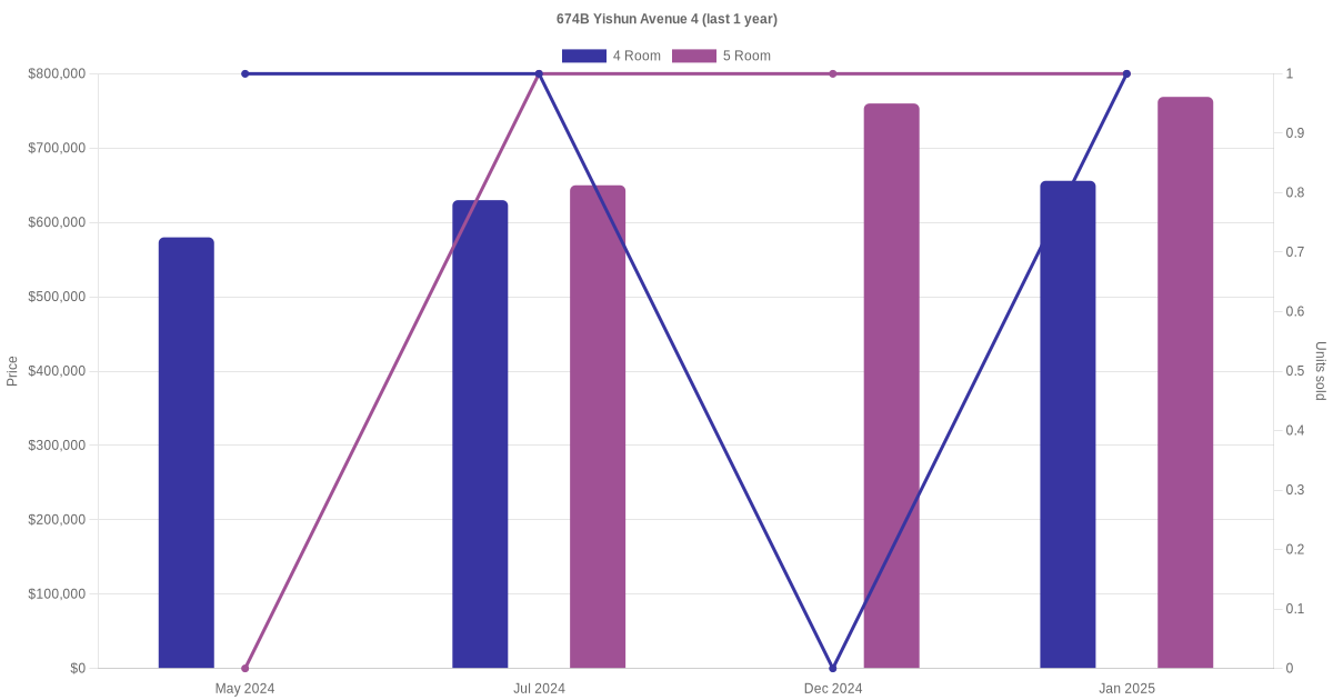 Below is a quick summary of the resale transactions volume and average price trends for the 4 room and 5 room units at 674B Yishun Avenue 4.
