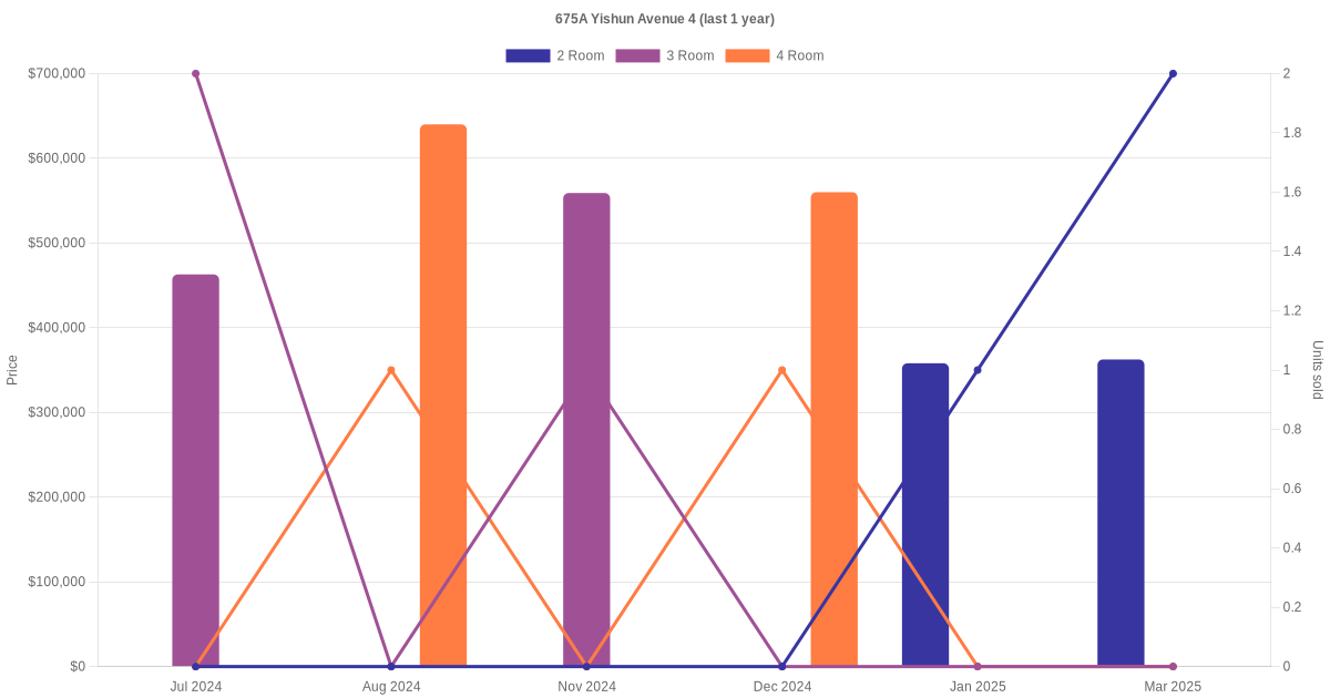 Here's a summary of the rental transactions and price trends for the 2 room, 3 room and 4 room units at 675A Yishun Avenue 4.