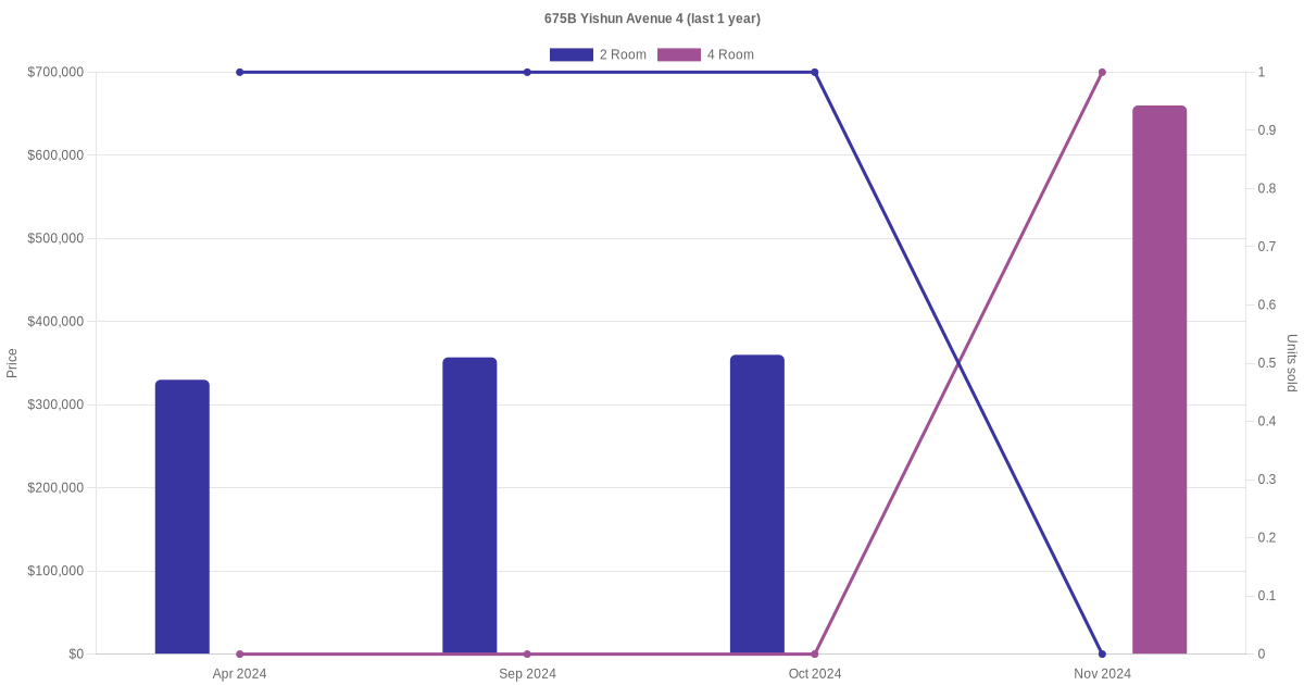 Below is a quick summary of the resale transactions volume and average price trends for the 2 room, 3 room and 4 room units at 675B Yishun Avenue 4.