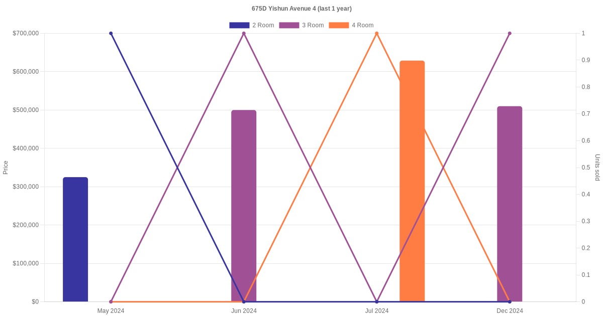 Below is a quick summary of the resale transactions volume and average price trends for the 2 room, 3 room and 4 room units at 675D Yishun Avenue 4.