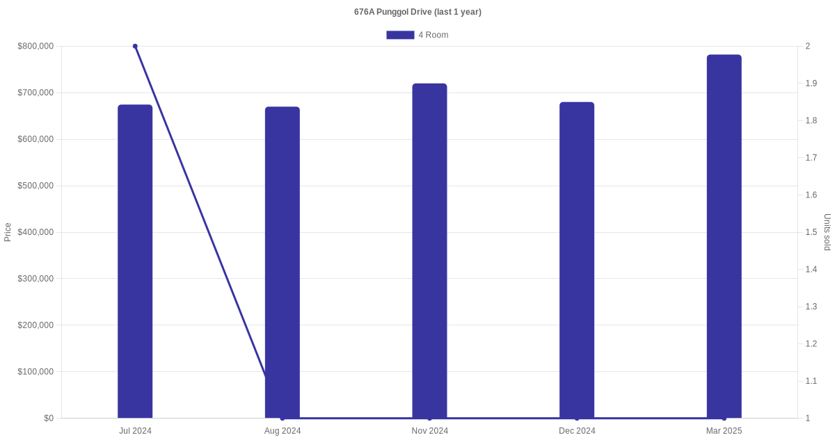 Below is a quick summary of the resale transactions volume and average price trends for the 4 room units at 676A Punggol Drive.